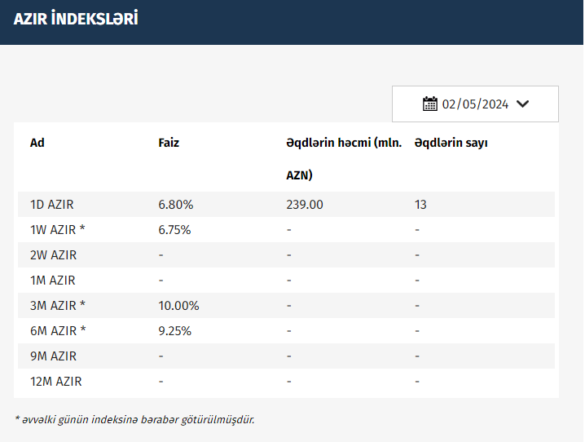 Azərbaycan Mərkəzi Bankı (AMB) 02.05.2024 tarixinə olan AZIR indekslərini açıqlayıb.