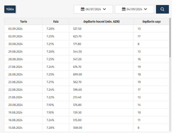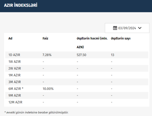 Azərbaycan Mərkəzi Bankı (AMB) 03.09.2024 tarixinə olan AZIR indekslərini açıqlayıb.