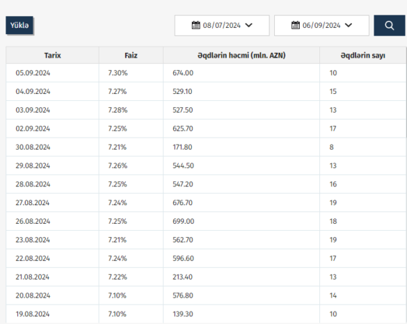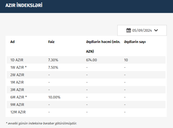 Azərbaycan Mərkəzi Bankı (AMB) 05.09.2024 tarixinə olan AZIR indekslərini açıqlayıb.