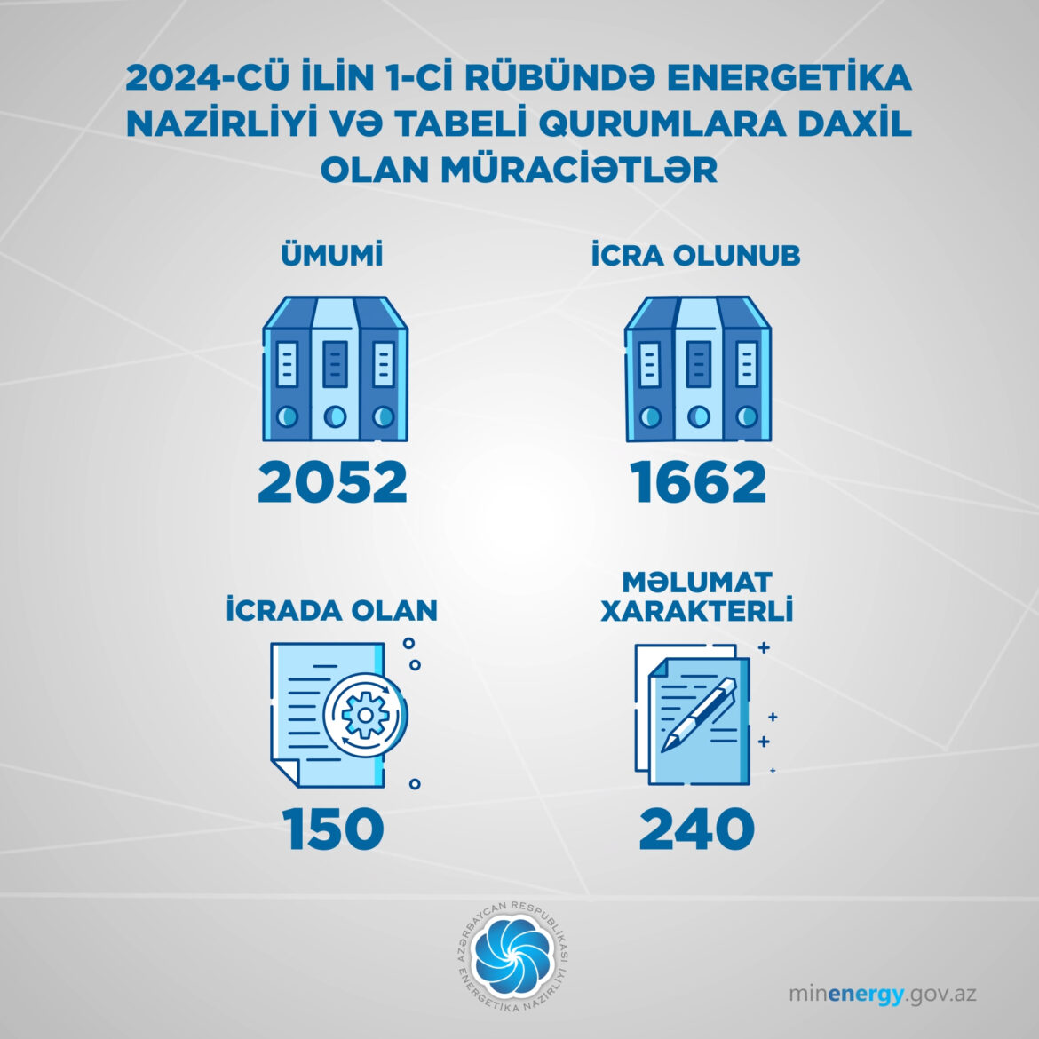 2024-cü ilin birinci rübü ərzində Energetika Nazirliyi və tabeli qurumlara 2052 vətəndaş müraciəti daxil olub.