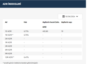 Azərbaycan Mərkəzi Bankı (AMB) 10.06.2024 tarixinə olan AZIR indekslərini açıqlayıb.