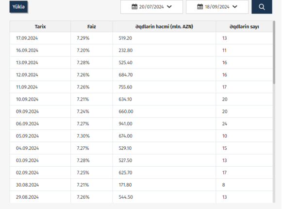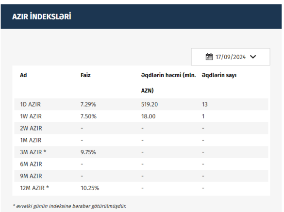 Azərbaycan Mərkəzi Bankı (AMB) 17.09.2024 tarixinə olan AZIR indekslərini açıqlayıb.