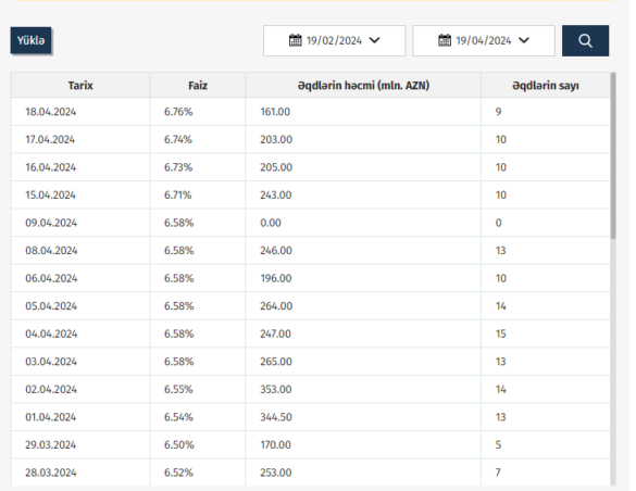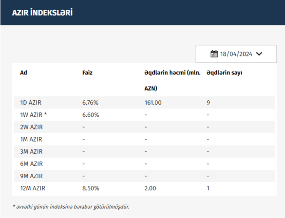 Azərbaycan Mərkəzi Bankı (AMB) 18.04.2024 tarixinə olan AZIR indekslərini açıqlayıb.