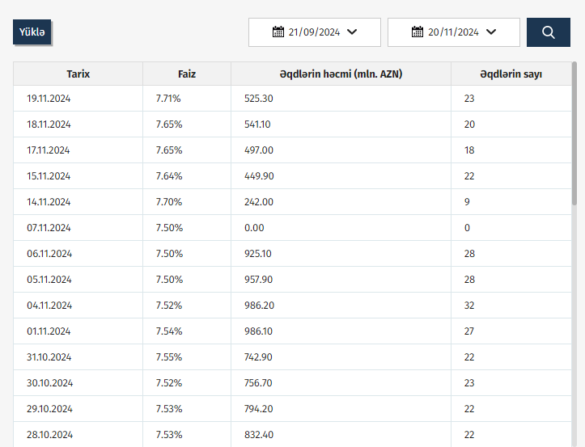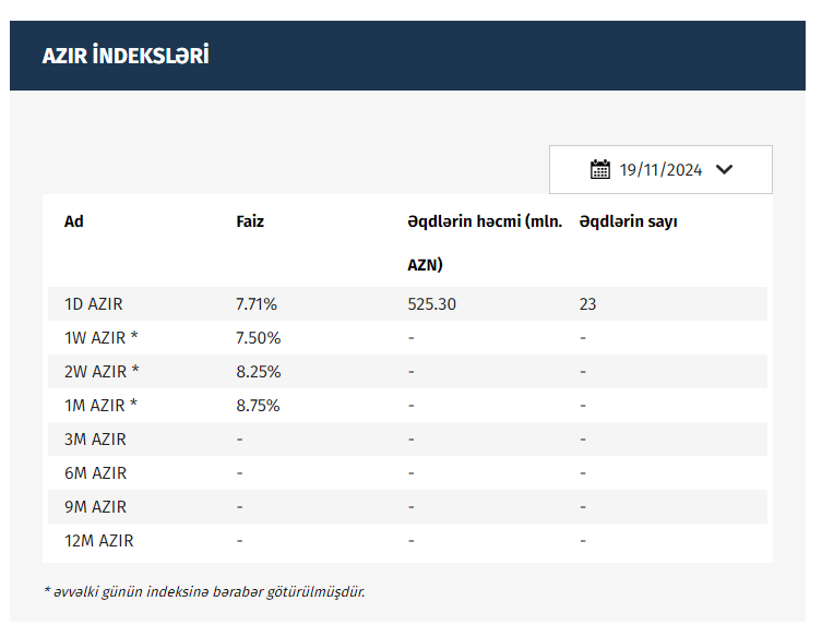 Azərbaycan Mərkəzi Bankı (AMB) 19.11.2024 tarixinə olan AZIR indekslərini açıqlayıb.