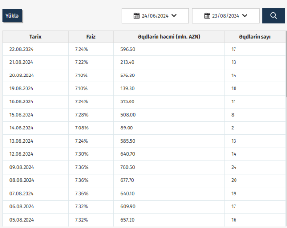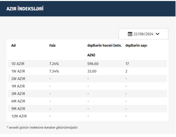 Azərbaycan Mərkəzi Bankı (AMB) 22.08.2024 tarixinə olan AZIR indekslərini açıqlayıb.