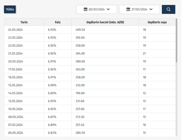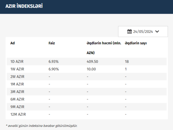 Azərbaycan Mərkəzi Bankı (AMB) 24.05.2024 tarixinə olan AZIR indekslərini açıqlayıb.