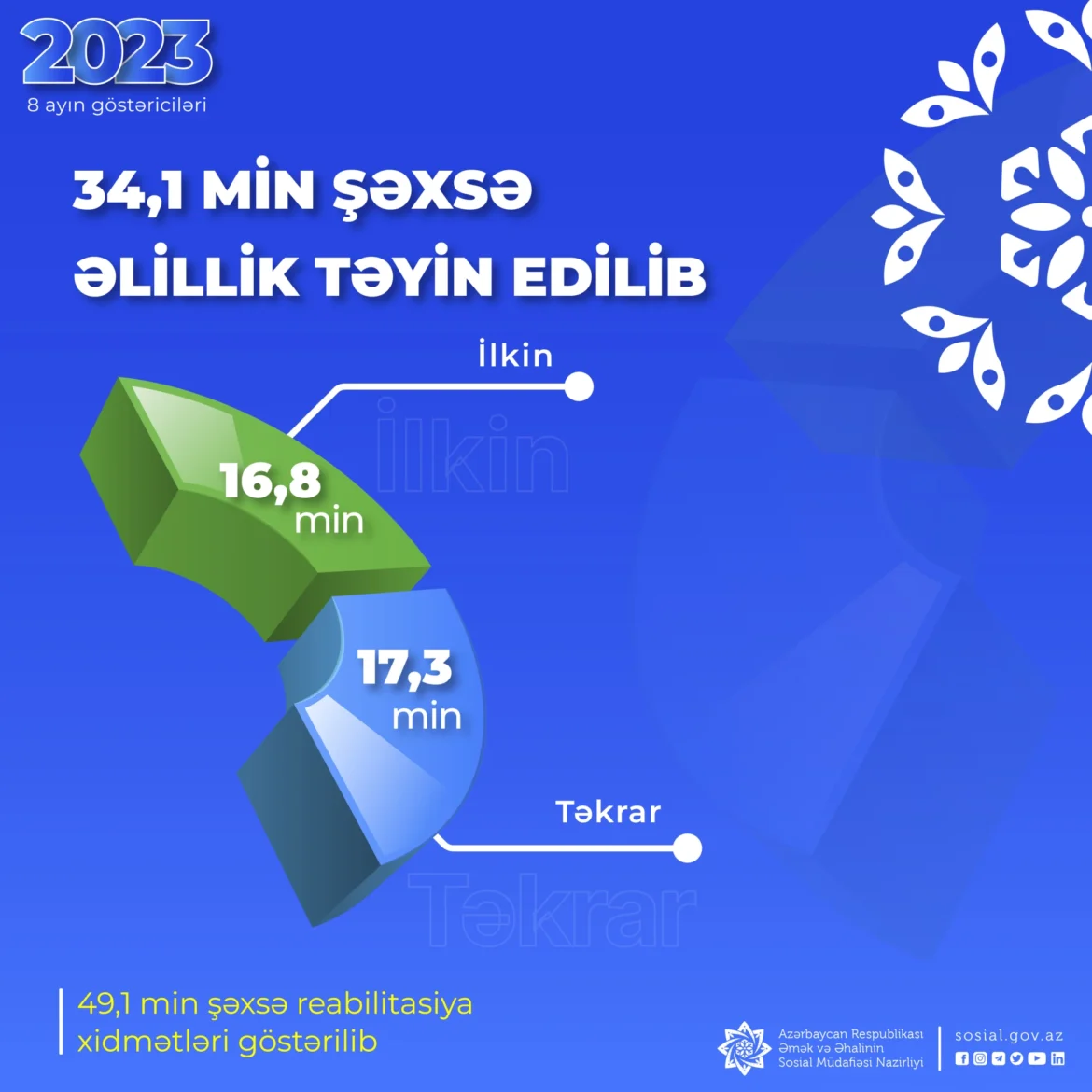 Əmək və Əhalinin Sosial Müdafiəsi Nazirliyinin tabeliyindəki Dövlət Tibbi-Sosial Ekspertiza və Reabilitasiya Agentliyi tərəfindən 2023-cü ilin yanvar-avqust ayları ərzində 34,1 min şəxsə əlillik təyin edilib. Onlardan 16,8 mininə ilkin, 17,3 mininə təkrar əlillik təyinatı aparılıb.