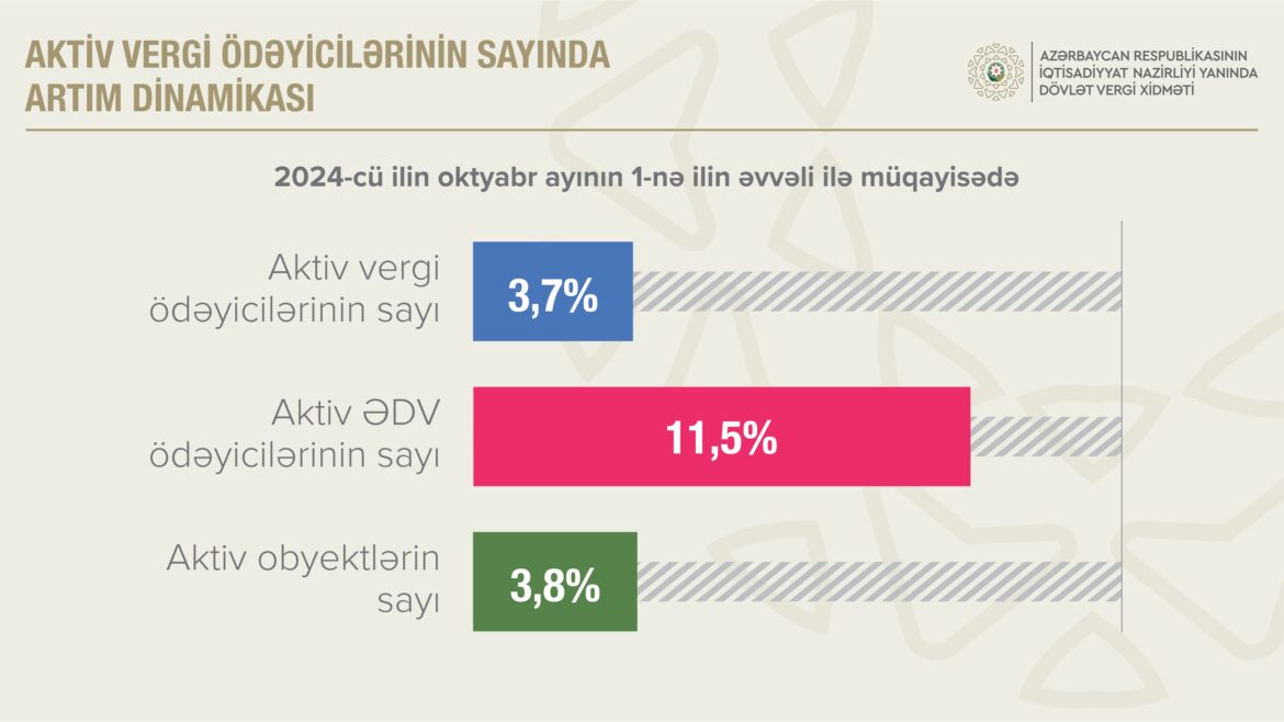 2024-cü ilin oktyabrın 1-nə aktiv vergi ödəyicilərinin sayı ilin əvvəli ilə müqayisədə 3,7 faiz artaraq 789,7 min olub. Aktiv ƏDV ödəyicilərinin sayı 11,5 faiz artaraq 51,0 min, aktiv təsərrüfat subyektlərinin (obyektlərinin) sayı isə 3,8 faiz artaraq 212,2 təşkil edib.