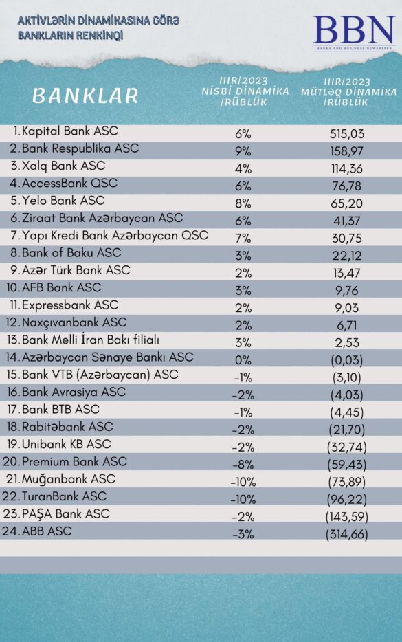 Banklar və Biznes nəşri BBN.az maliyyə göstəricilərini Azərbaycan Banklar Assosiasiyasına (ABA) təqdim etmiş bankların aktivlərinin dinamikasına görə renkinqini təqdim edir.