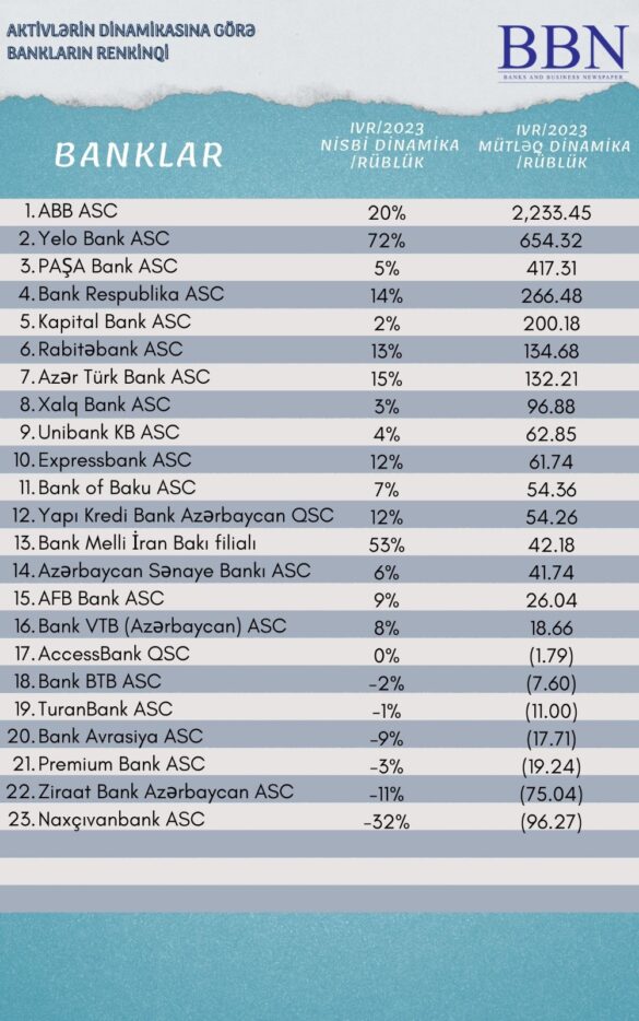 Banklar və Biznes nəşri BBN.az maliyyə göstəricilərini Azərbaycan Banklar Assosiasiyasına (ABA) təqdim etmiş bankların aktivlərinin dinamikasına görə renkinqini təqdim edir.
