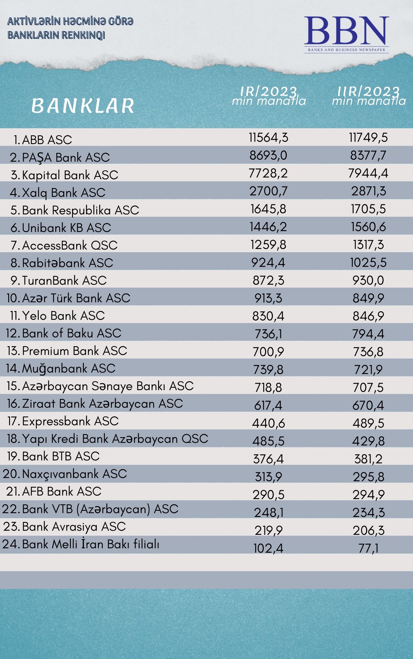 Banklar və Biznes nəşri BBN.az maliyyə göstəricilərini Azərbaycan Banklar Assosiasiyasına (ABA) təqdim etmiş bankların aktivlərinin həcminə görə renkinqini təqdim edir.
