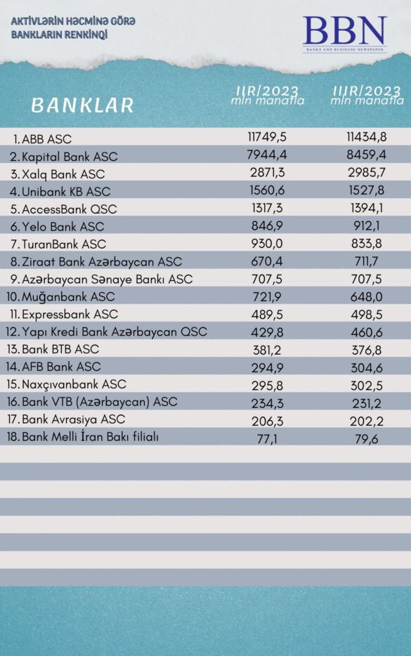 Banklar və Biznes nəşri BBN.az maliyyə göstəricilərini Azərbaycan Banklar Assosiasiyasına (ABA) təqdim etmiş bankların aktivlərinin həcminə görə statistik göstəricilərini təqdim edir.