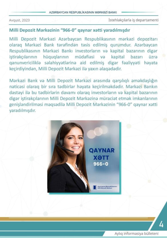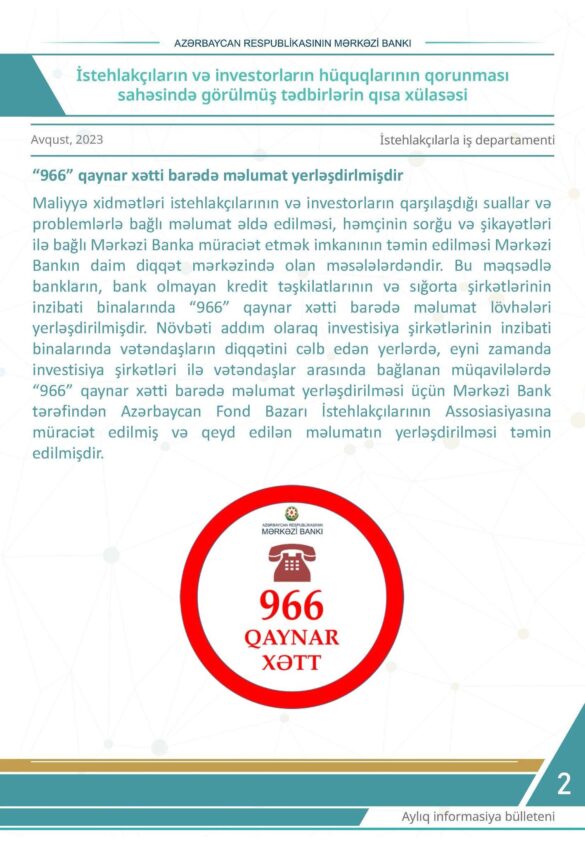 Azərbaycan Mərkəzi Bankı (AMB) tərəfindən maliyyə xidmətləri istehlakçılarının və investorların hüquqlarının müdafiəsi, eyni zamanda maliyyə savadlılığının artırılması istiqamətində avqust ayında görülmüş işlər barədə elektron bülleten dərc edilib.