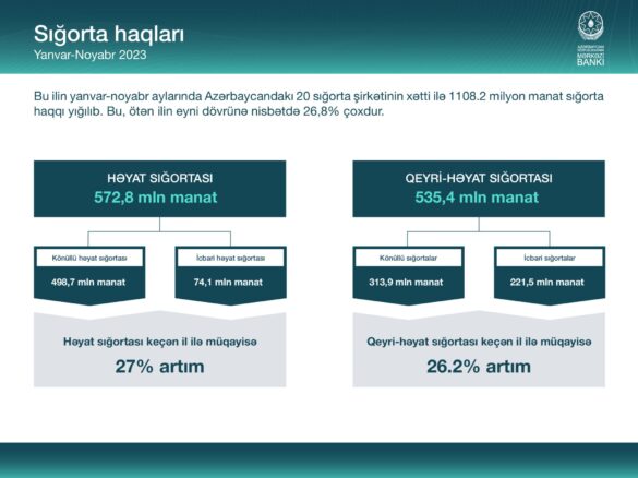 Bu ilin yanvar-noyabr aylarında Azərbaycandakı 20 sığorta şirkətinin xətti ilə 1 milyard 108,234 milyon manat sığorta haqqı toplanılıb.