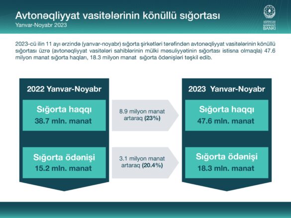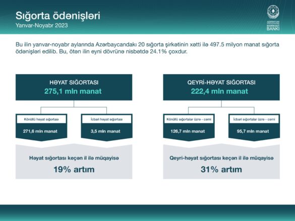 Hesabat dövründə sığorta şirkətlərinin həyata keçirdikləri ödənişlərin məbləği isə 497,5 milyon manat təşkil edib. Bu isə illik müqayisədə 24,1% çoxdur.