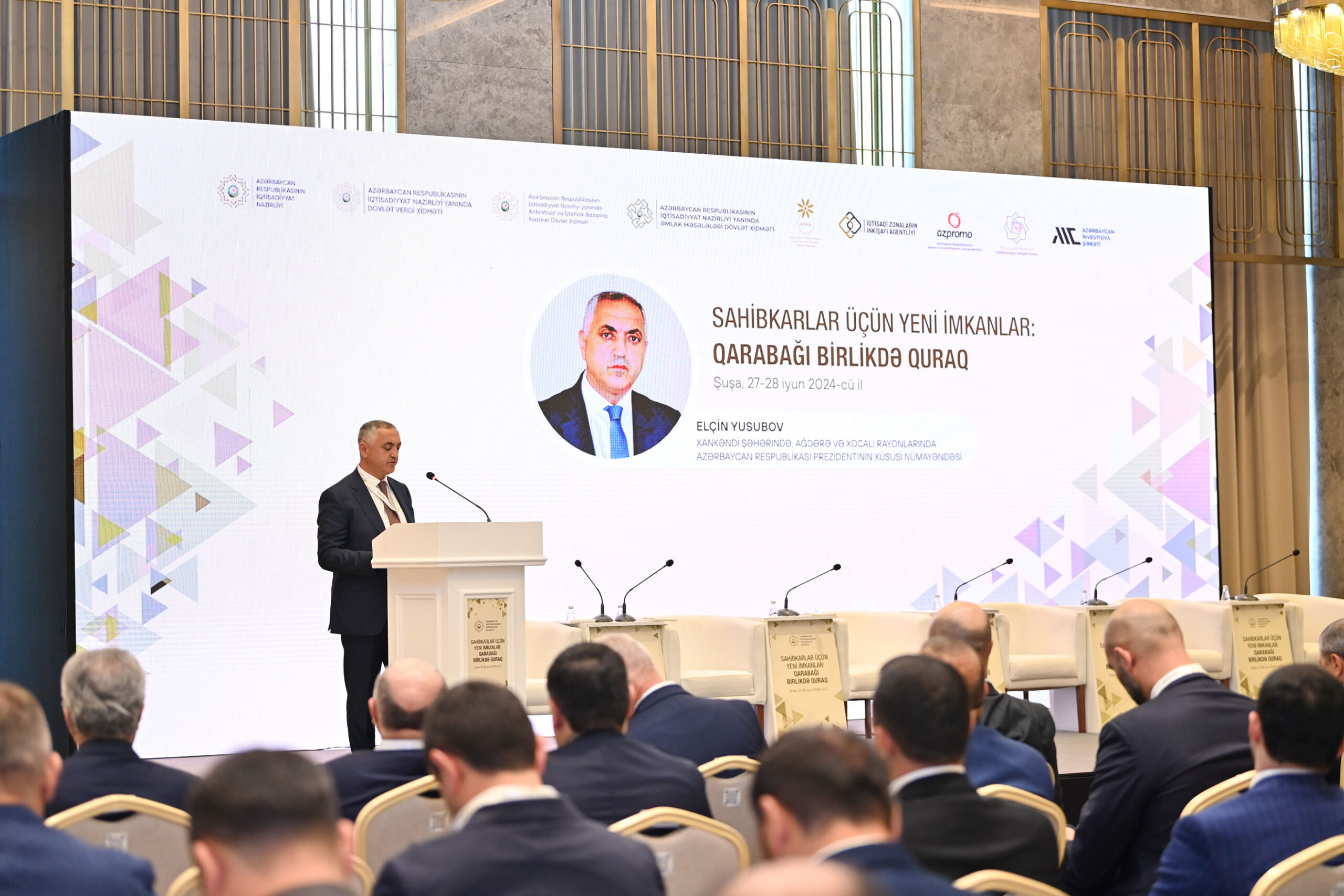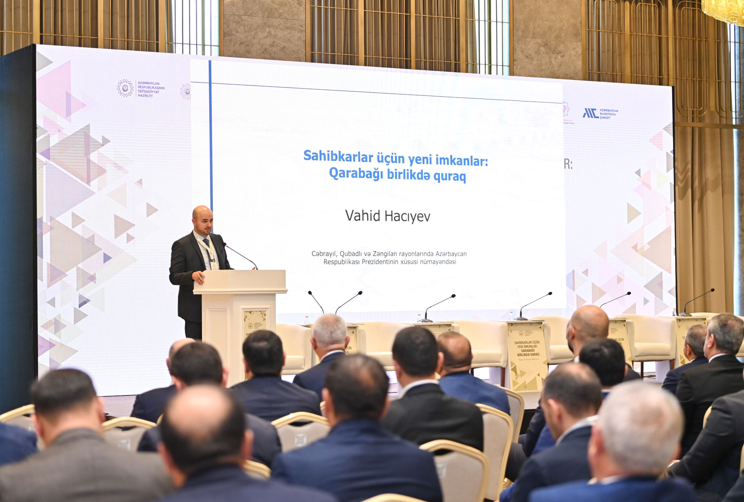 İqtisadiyyat naziri Mikayıl Cabbarov dövlət və biznes təmsilçilərinin iştirakı ilə keçirilən birgə tədbirlərin müsbət ənənəyə çevrildiyini, bugünkü görüşün də regionun inkişafına və özəl sektorun güclənməsinə töhfə verəcəyini vurğulayıb. Bildirilib ki, Prezident İlham Əliyevin rəhbərliyi ilə ölkəmizdə sosial-iqtisadi inkişaf sahəsində böyük uğurlar əldə edilib. Prezident İlham Əliyev azad olunmuş ərazilərin iqtisadi reinteqrasiyasına böyük diqqət yetirir. Azad olunmuş ərazilərdə aparılan bərpa və quruculuq işləri iqtisadi və sosial inkişaf üçün yeni imkanlar açıb. Regionda biznesin inkişafı üçün yaradılan şərait, dövlət-sahibkar işbirliyi müstəvisində yeni layihələr reallığa çevrilib. İlk növbədə, vətəndaş olaraq hər birimiz üçün işğaldan azad edilmiş ərazilərin bərpası və iqtisadi dirçəlişi əsas prioritetdir. Dövlət bu sahədə üzərinə düşən öhdəlikləri yerinə yetirir, biznes üçün bölgədə əlverişli şəraiti təmin edir. Vurğulanıb ki, bölgəyə biznes subyektlərinin artan marağı nəzərə alınsa, belə fürsətlərdən yararlanmaq həmişə asan olmayacaq. Nazir azad olunmuş ərazilərə ilk vaxtlarda investisiya yatırmış sahibkarlara təşəkkürünü bildirib. Bildirilib ki, bugünkü tədbir çərçivəsində azad edilmiş ərazilərin biznes imkanları ilə tanış olmuş bir sıra sahibkarlar artıq bölgədə öz layihələrini reallaşdıracaqları ilə bağlı qərar veriblər. Regionda əhalinin iş yerləri və mənzillə təmin olunması məqsədilə müvafiq qurumlarla birgə iş aparıldığı diqqətə çatdırılıb.