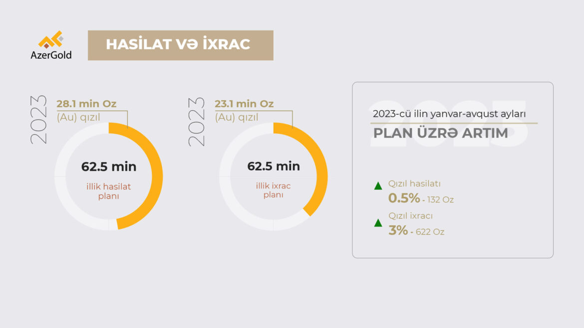 2023-cü ilin yanvar-avqust aylarında QSC tərəfindən 28.1 min unsiya qızılın hasilatı, 23.1 min unsiya qızılın ixracı həyata keçirilib. Bununla cari ilin ilk 8 ayı üçün müəyyənləşdirilmiş qızıl hasilatı planı 0.5%, qızıl ixracı planı isə 3% artıq icra edilib. Ümumilikdə, cari il üzrə 62.5 min unsiya qızıl hasilatı və ixracı planlaşdırılıb ki, bu da ötən ilin göstəriciləri ilə müqayisədə hasilatda 1%, ixracda isə 4.4% daha artıq hədəfdir.