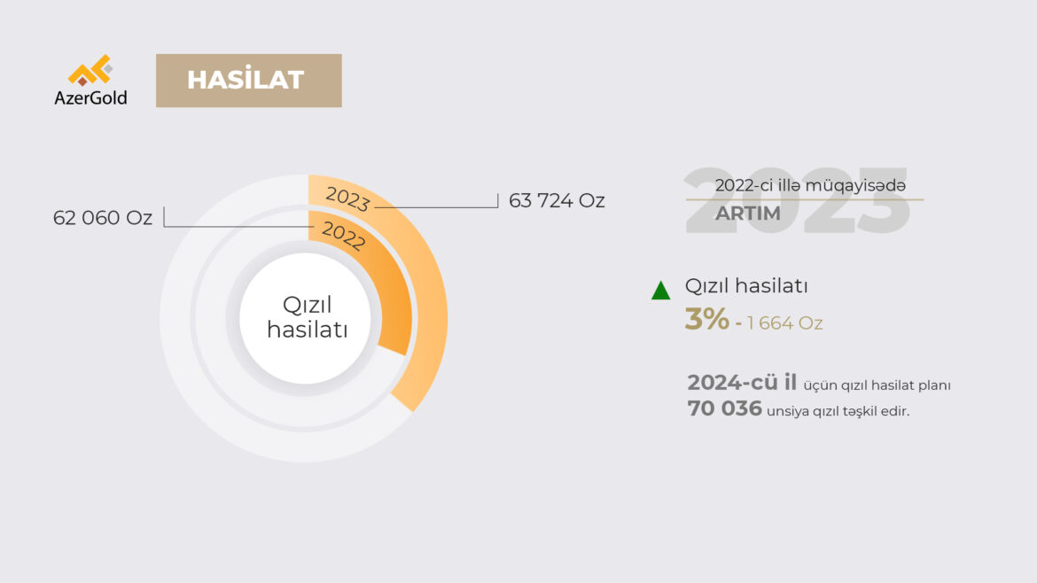 “AzerGold” Qapalı Səhmdar Cəmiyyəti (QSC) tərəfindən 2023-cü ildə qızıl hasilatı 63.7 min unsiyaya çatdırılıb. 2022-ci illə müqayisədə 2023-cü ildə 1.7 min unsiya artım (3%) qeydə alınıb. Bu, həm də fəaliyyət dövrü ərzində ən yüksək illik göstəricidir.