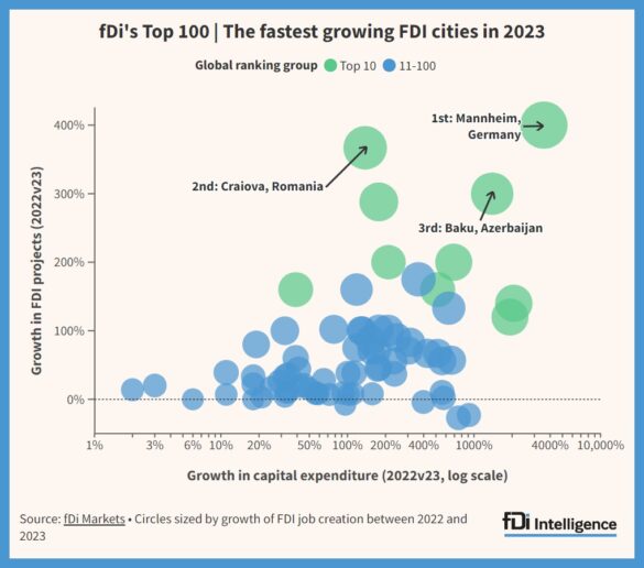 “Financial Times”ın “FDI Intelligence” nəşrinin reytinq cədvəlində ilk yeri Almaniyanın Manheyim şəhəri, ikinci yerdə isə Rumıniyanın Krayova şəhəri yer alıb. Hesabatda bildirilir ki, 2023-cü ildə dünya üzrə şirkətlər tərəfindən 1,33 trilyon dollar dəyərində birbaşa xarici investisiyaların qoyulması barədə razılığa gəlinib ki, bu da əvvəlki illə müqayisədə 4% çoxdur.
