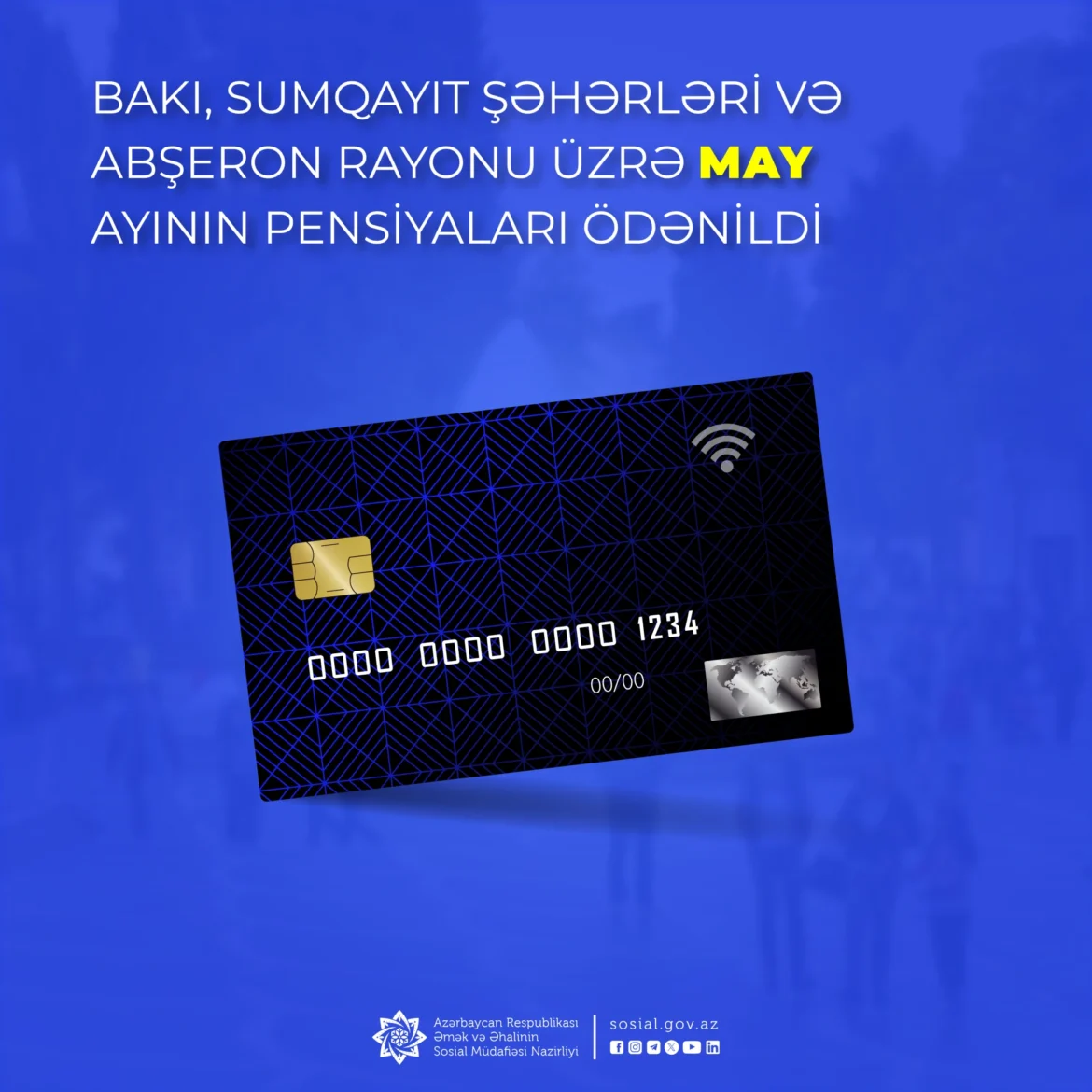 Əmək və Əhalinin Sosial Müdafiəsi Nazirliyinin tabeliyində Dövlət Sosial Müdafiə Fondu tərəfindən bu gün Bakı, Sumqayıt şəhərləri və Abşeron rayonu üzrə may ayının pensiyaları ödənilib.