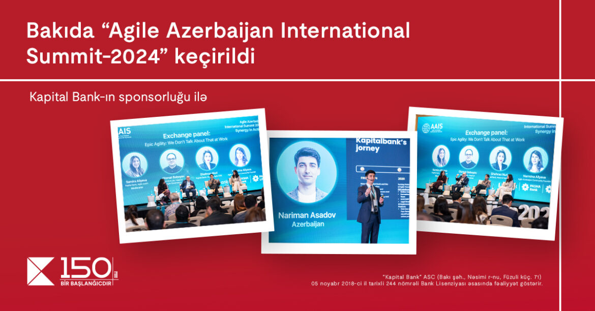 Ölkənin birinci bankı Kapital Bank-ın sponsorluğu ilə “Agile Azerbaijan International Summit-2024” (“Agile Azərbaycan Beynəlxalq Sammiti -2024”) baş tutdu. Tədbir regionda Agile metodologiyalarına və onların müxtəlif sahələrdə, o cümlədən məhsul inkişafı və innovativ texnologiyalarda tətbiqinə həsr olunan ən böyük tədbirlərdən biridir. Sammitin builki əsas istiqamətləri “Agile-ın məhsulun inkişafı və idarə edilməsinə təsiri” və “Süni İntellekt (AI) və onun Agile yanaşmalarına inteqrasiyası” idi. Eyni zamanda tədbirdə Agile metodologiyalarına aid olan bir çox vacib mövzu müzakirə edildi.