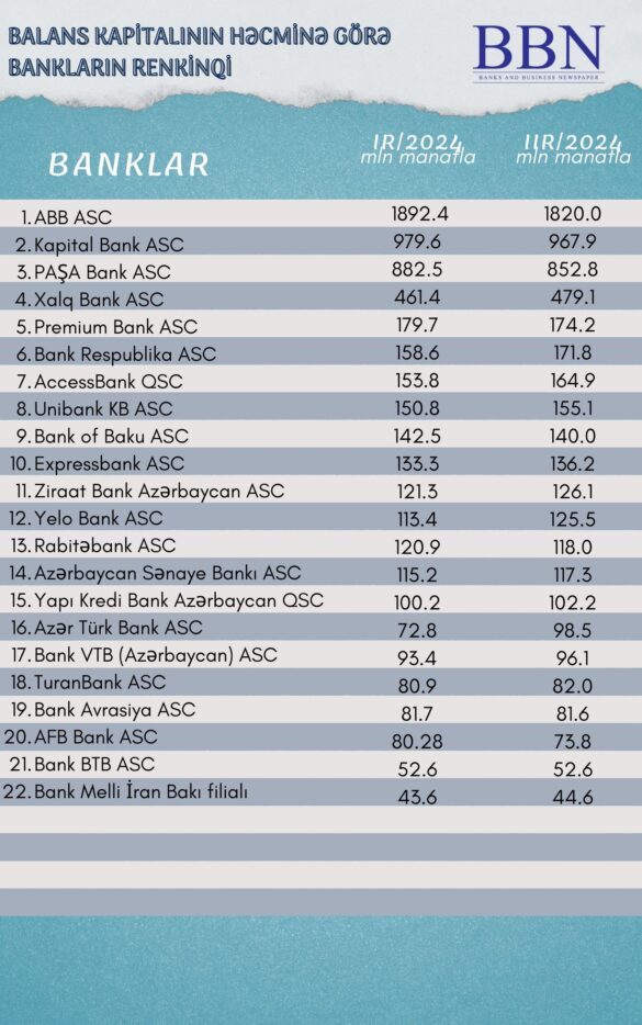 Banklar və Biznes nəşri BBN.az maliyyə göstəricilərini Azərbaycan Banklar Assosiasiyasına (ABA) təqdim etmiş bankların balans kapitalının həcminə görə renkinqini təqdim edir.