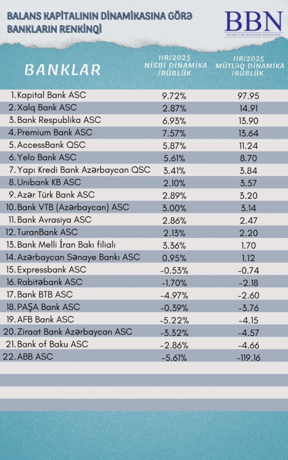 Banklar və Biznes nəşri BBN.az maliyyə göstəricilərini Azərbaycan Banklar Assosiasiyasına (ABA) təqdim etmiş bankların balans kapitalının dinamikasına görə renkinqini təqdim edir.