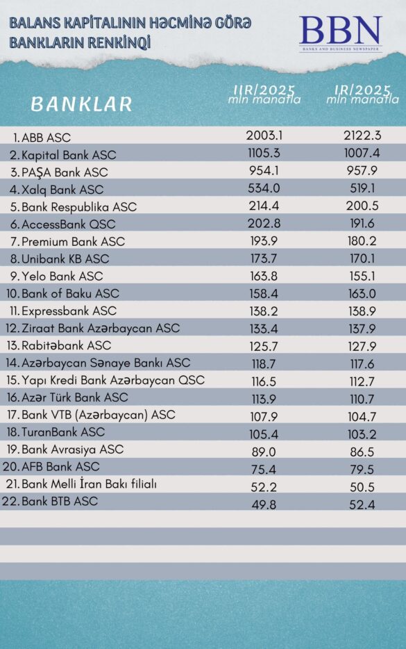 Banklar və Biznes nəşri BBN.az maliyyə göstəricilərini Azərbaycan Banklar Assosiasiyasına (ABA) təqdim etmiş bankların balans kapitalının həcminə görə renkinqini təqdim edir.