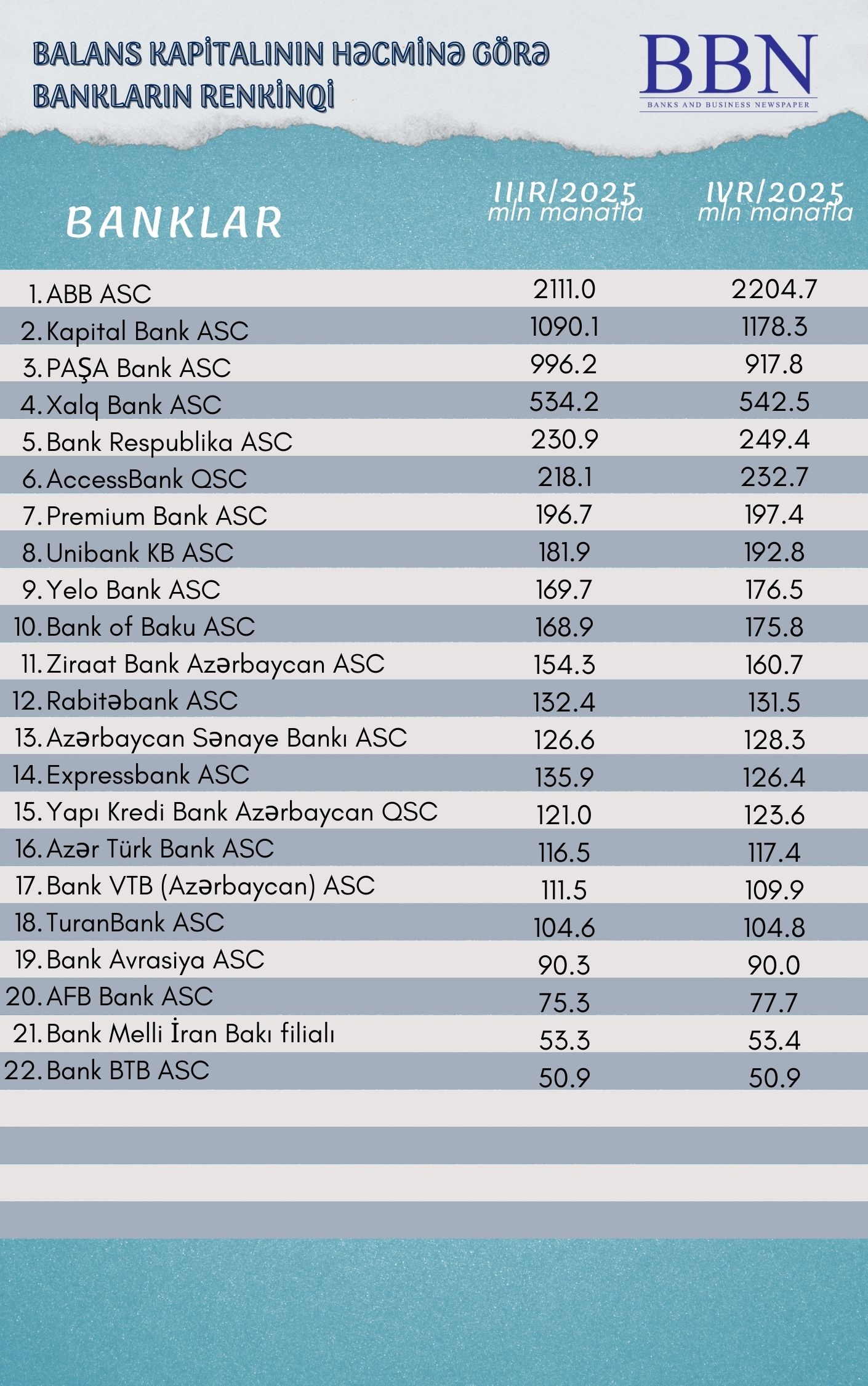 Banklar və Biznes nəşri BBN.az maliyyə göstəricilərini Azərbaycan Banklar Assosiasiyasına (ABA) təqdim etmiş bankların balans kapitalının həcminə görə renkinqini təqdim edir.