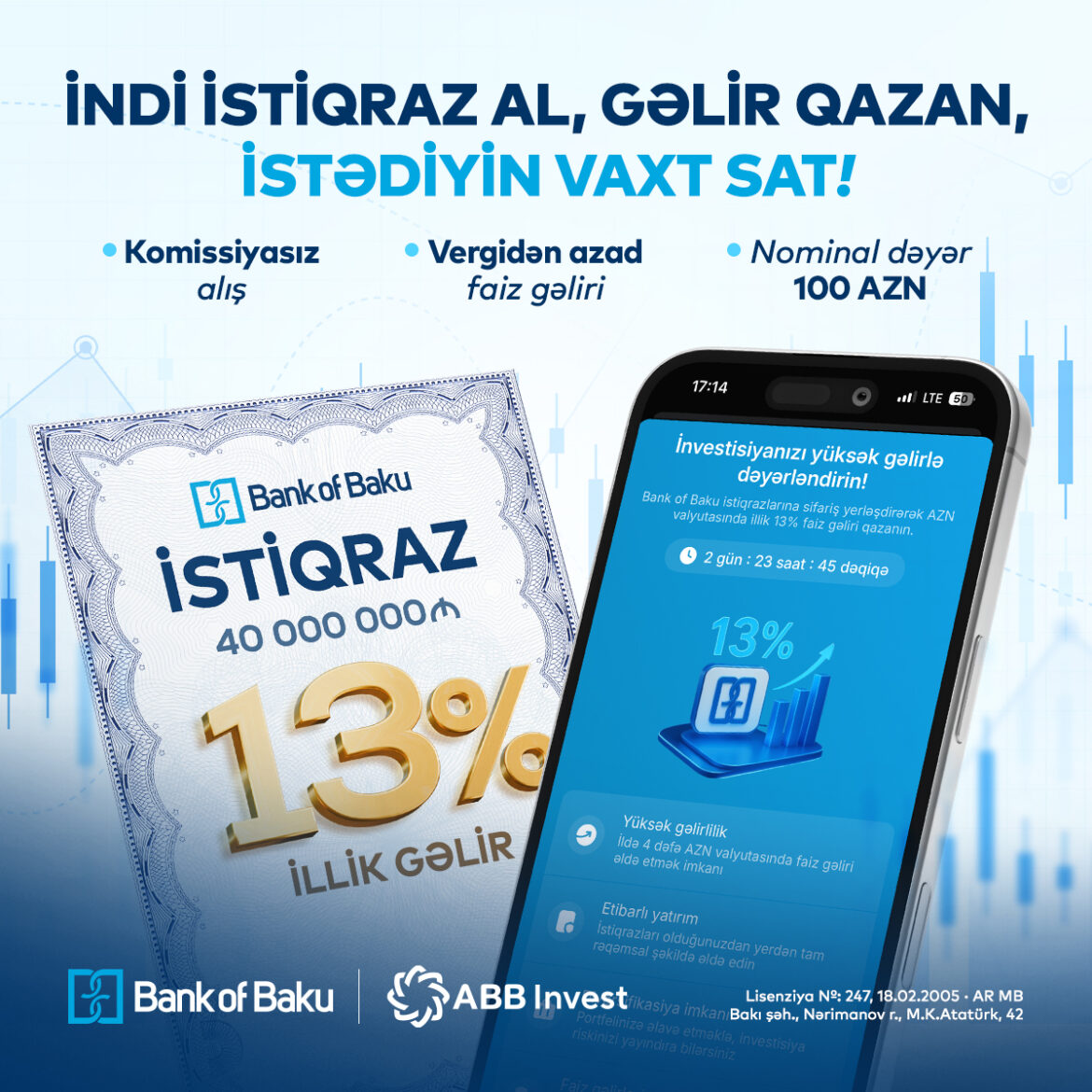 İndi Bank of Baku istiqrazlarını əldə edərək illik 13% gəlir qazanmaq və istənilən vaxt geri satmaq mümkündür.