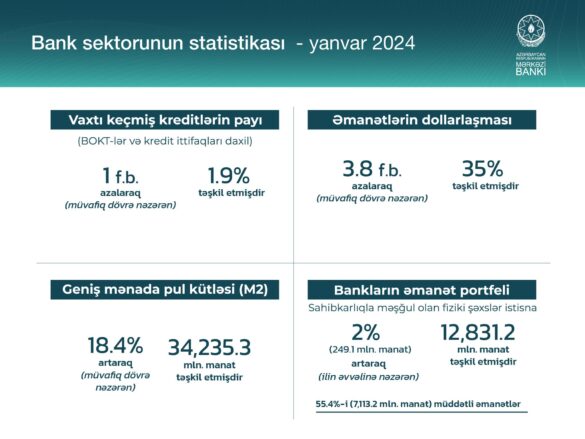 Eyni zamanda bu il fevralın ayının 1-nə Azərbaycanda problemli kreditlərin həcmi əvvəlki aya nisbətən 3.6% azalaraq 454.1 milyon manata enib. Vaxtı ötmüş kreditlər ötən ilin eyni dövrü ilə müqayisədə isə 22.2% azalıb.