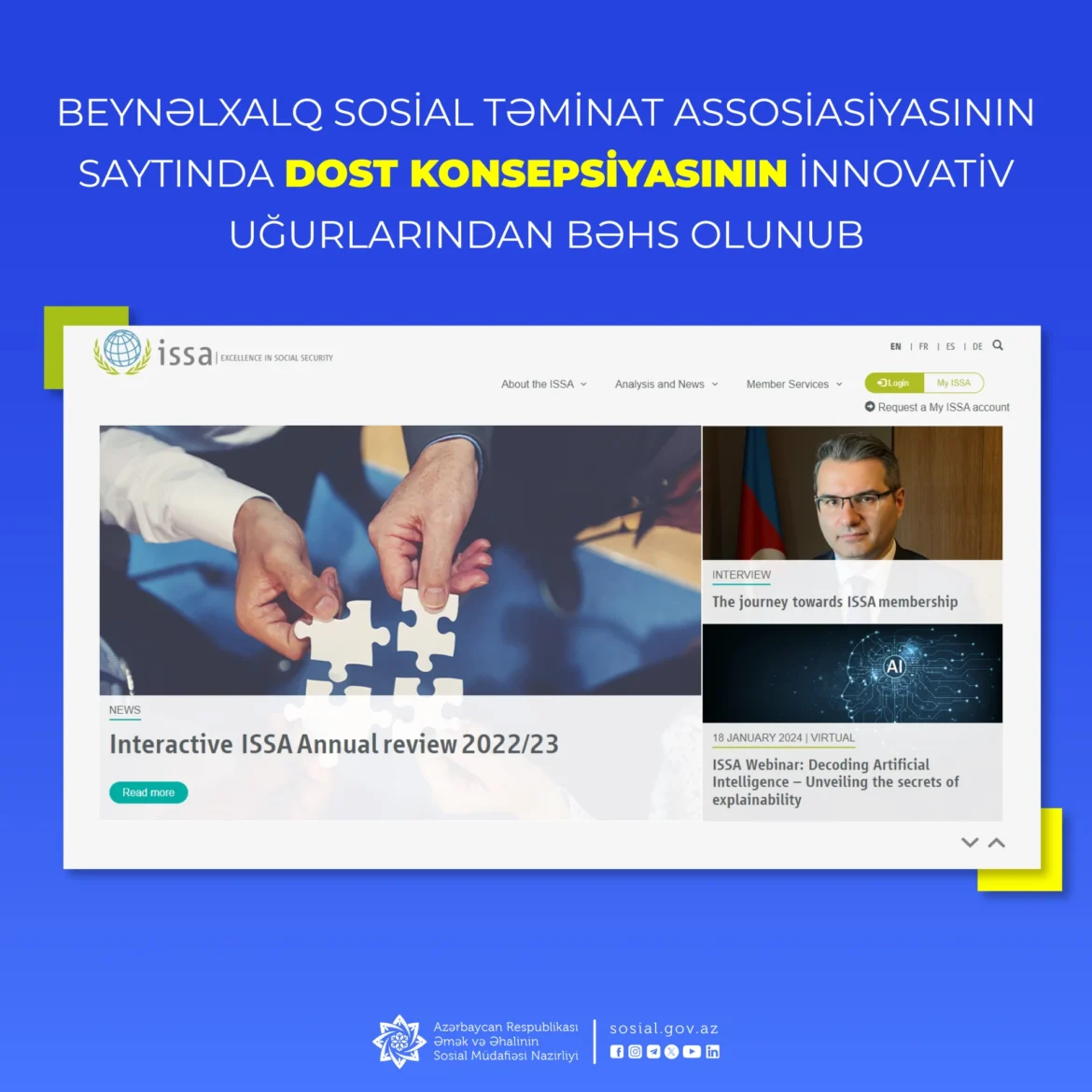 Dünyanın 160-dan çox ölkəsinin sosial sahə üzrə qurumlarını özündə birləşdirən Beynəlxalq Sosial Təminat Assosiasiyasının (BSTA) saytında Əmək və Əhalinin Sosial Müdafiəsi Nazirliyinin tabeliyindəki DOST Agentliyinin İdarə Heyətinin sədri Fərid Məmmədovla müsahibə dərc olunub. https://www.issa.int/news/journey-towards-issa-membership