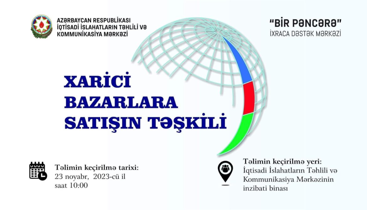 23 noyabr 2023-cü il tarixində “Bir Pəncərə” İxraca Dəstək Mərkəzi “Xarici bazarlara satışın təşkili” mövzusunda təlim keçirəcək.