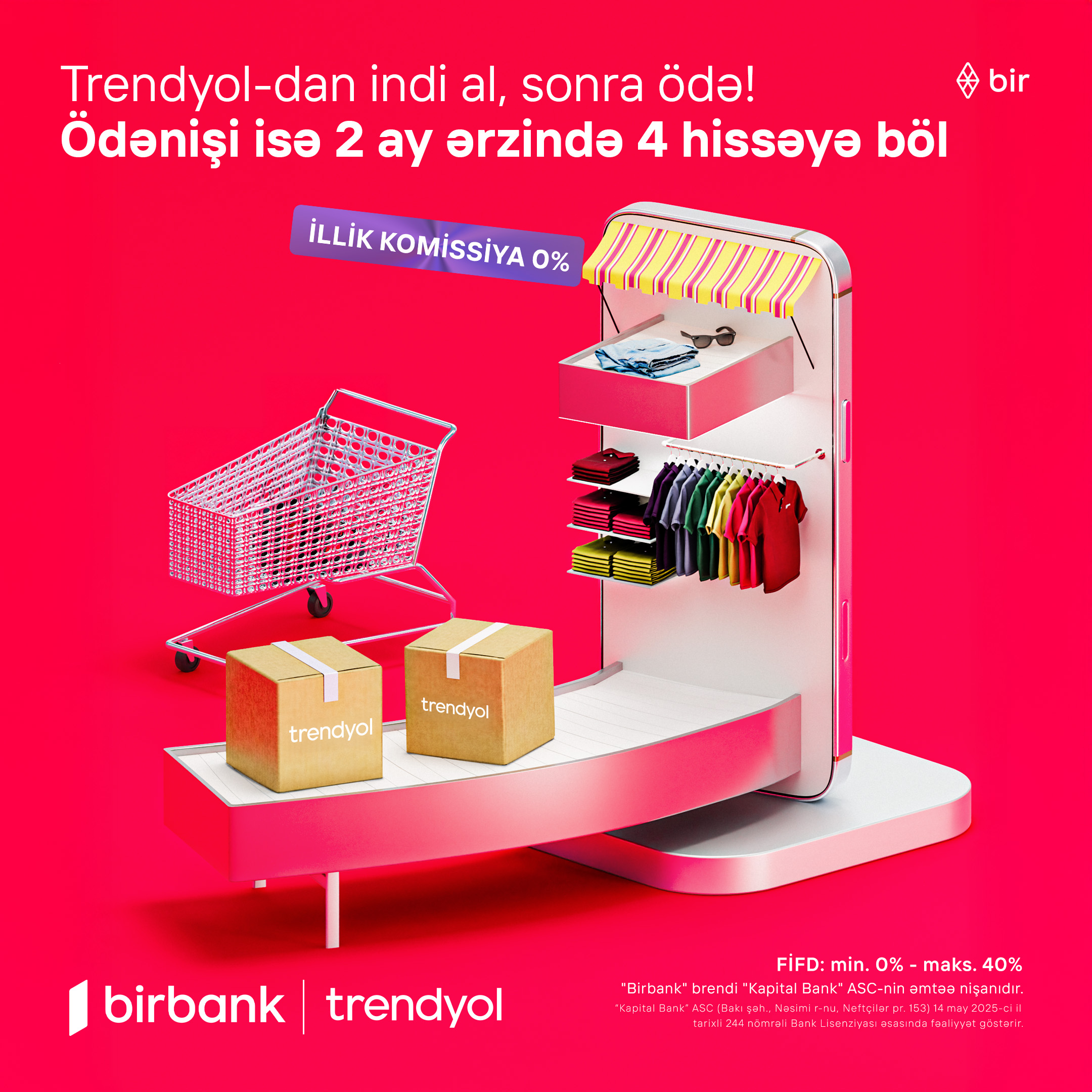 Trendyolda sevdiyiniz məhsulları indi sifariş edib, ödənişi isə hissə-hissə etmək imkanınız var. Birbank-ın təqdim etdiyi “İndi al, sonra ödə” xidməti ilə alış-veriş zamanı xərclərinizi 4 bərabər hissəyə bölərək 2 ay ərzində rahatlıqla ödəyə bilərsiniz.