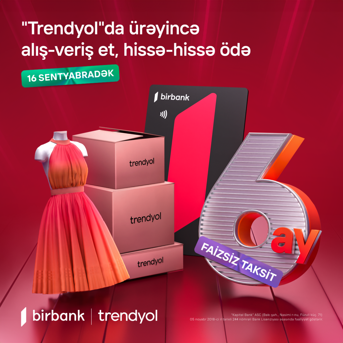 Ölkənin ilk rəqəmsal bankı Birbank taksit kartı sahibi olan müştərilərinə sərfəli alış-veriş fürsətləri yaratmağa davam edir. Belə ki, 16 sentyabr 2024-cü il tarixinədək Birbank taksit kartı sahibləri “Trendyol”dan istədikləri məhsulu sifariş edərək 6 aylıq faizsiz taksit imkanından yararlana bilərlər.