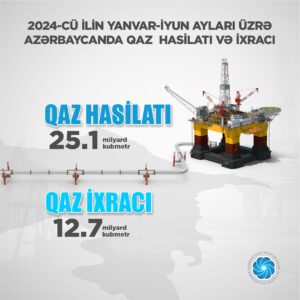 6 ay ərzində ölkədə 25,1 milyard kubmetr təbii qaz hasil edilib. Qazın 6,5 milyard kubmetri AÇG-dən, 14 milyard kubmetri “Şahdəniz”dən, 0,8 milyard kubmetri Abşerondan, 3,8 milyard kubmetri SOCAR üzrə hasil olunub. Ötən ilin müvafiq dövrünə nisbətən qaz hasilatında təqribən 1 milyard kubmetr, yəni 4,3 faiz artım qeydə alınıb.