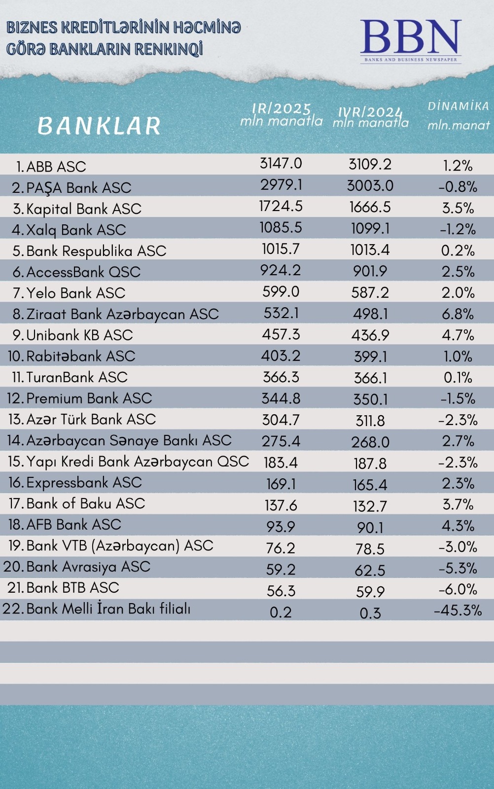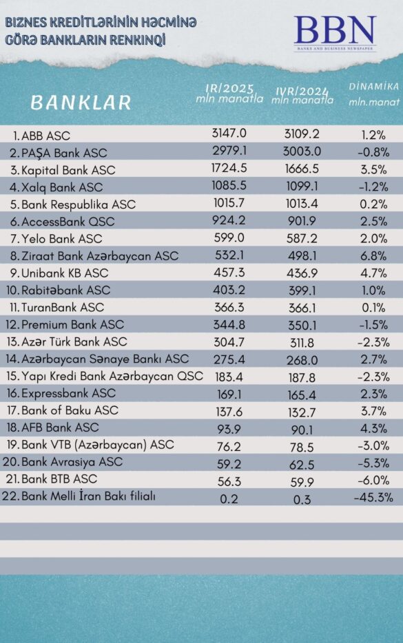 Banklar və Biznes nəşri BBN.az maliyyə göstəricilərini Azərbaycan Banklar Assosiasiyasına (ABA) təqdim etmiş bankların biznes kreditlərinin həcminə görə renkinqini təqdim edir.