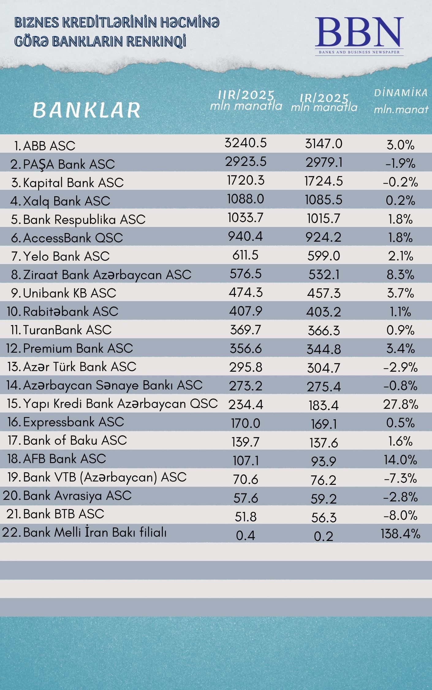 Banklar və Biznes nəşri BBN.az maliyyə göstəricilərini Azərbaycan Banklar Assosiasiyasına (ABA) təqdim etmiş bankların biznes kreditlərinin həcminə görə renkinqini təqdim edir.