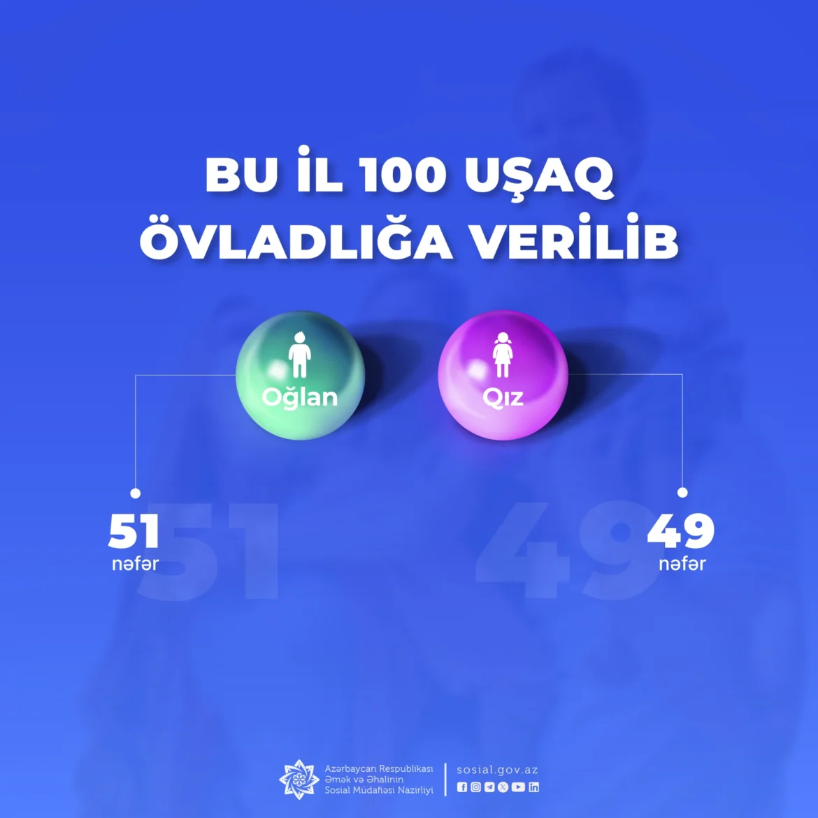 2023-cü ilin ötən dövründə 100 uşaq övladlığa verilib. Onlardan 51 nəfəri oğlan, 49 nəfəri isə qızdır. Övladlığa verilən uşaqlardan 66 nəfəri yaxın qohumu tərəfindən övladlığa götürülüb.