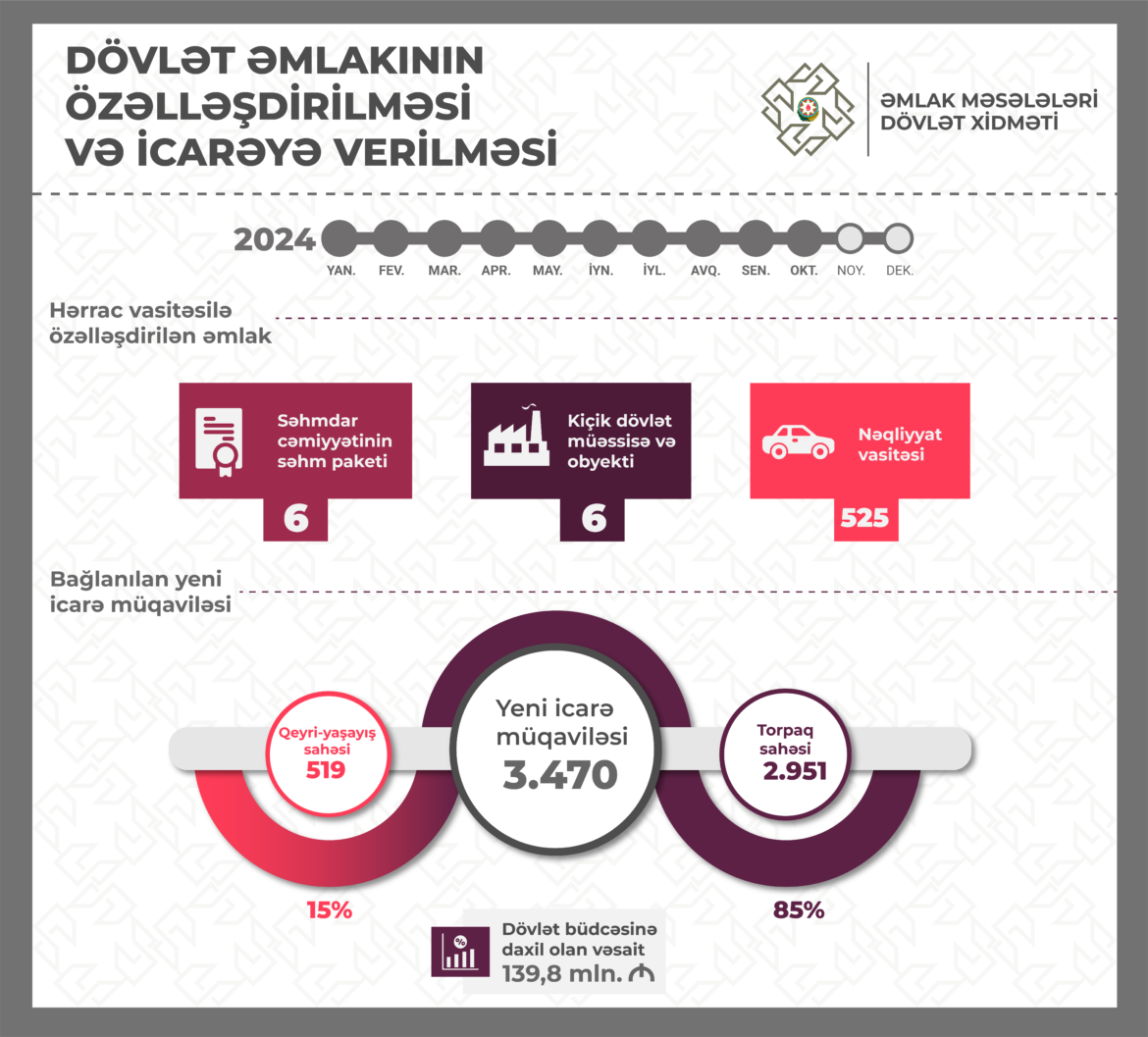Əmlak Məsələləri Dövlət Xidməti tərəfindən 2024-cü ilin 10 ayında özəlləşdirmə və icarədən dövlət büdcəsinə 139,8 milyon manat vəsaitin ödənilməsi təmin edilib.