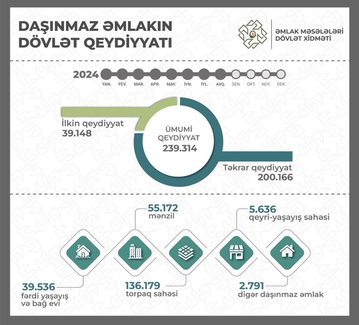 2024-cü ilin ilk 8 ayında fərdi yaşayış və bağ evi üzərində – 39.536, mənzil üzərində – 55.172, torpaq sahəsi – 136.179, qeyri-yaşayış binası – 2.229, qeyri-yaşayış sahəsi – 5.636, əmlak kompleksi – 526, çoxmərtəbəli yaşayış binası üzərində isə 36 mülkiyyət hüququnun dövlət qeydiyyatı aparılıb. Bu dövrdə qeydiyyata alınan mülkiyyət hüquqlarının 63.933-ü Bakının, qalan hissəsi isə bölgələrin payına düşür.