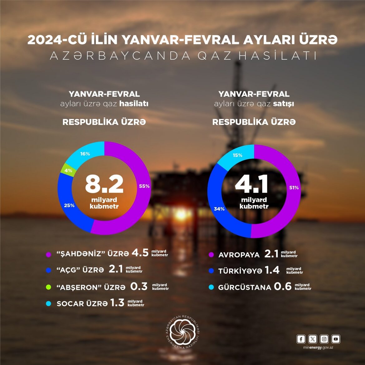 2024-cü ilin yanvar-fevral ayları üzrə operativ məlumatlara əsasən, iki ay ərzində respublikada 8,2 milyard kubmetr təbii qaz hasil edilib. Qazın 2,1 milyard kubmetri “Azəri-Çıraq-Günəşli”, 4,5 milyard kubmetri “Şahdəniz”, 0,3 milyard kubmetri “Abşeron”, 1,3 milyard kubmetri SOCAR üzrə hasil olunub. Ötən ilin müvafiq dövrünə nisbətən 240 milyon kubmetr artımla qaz hasil edilib.
