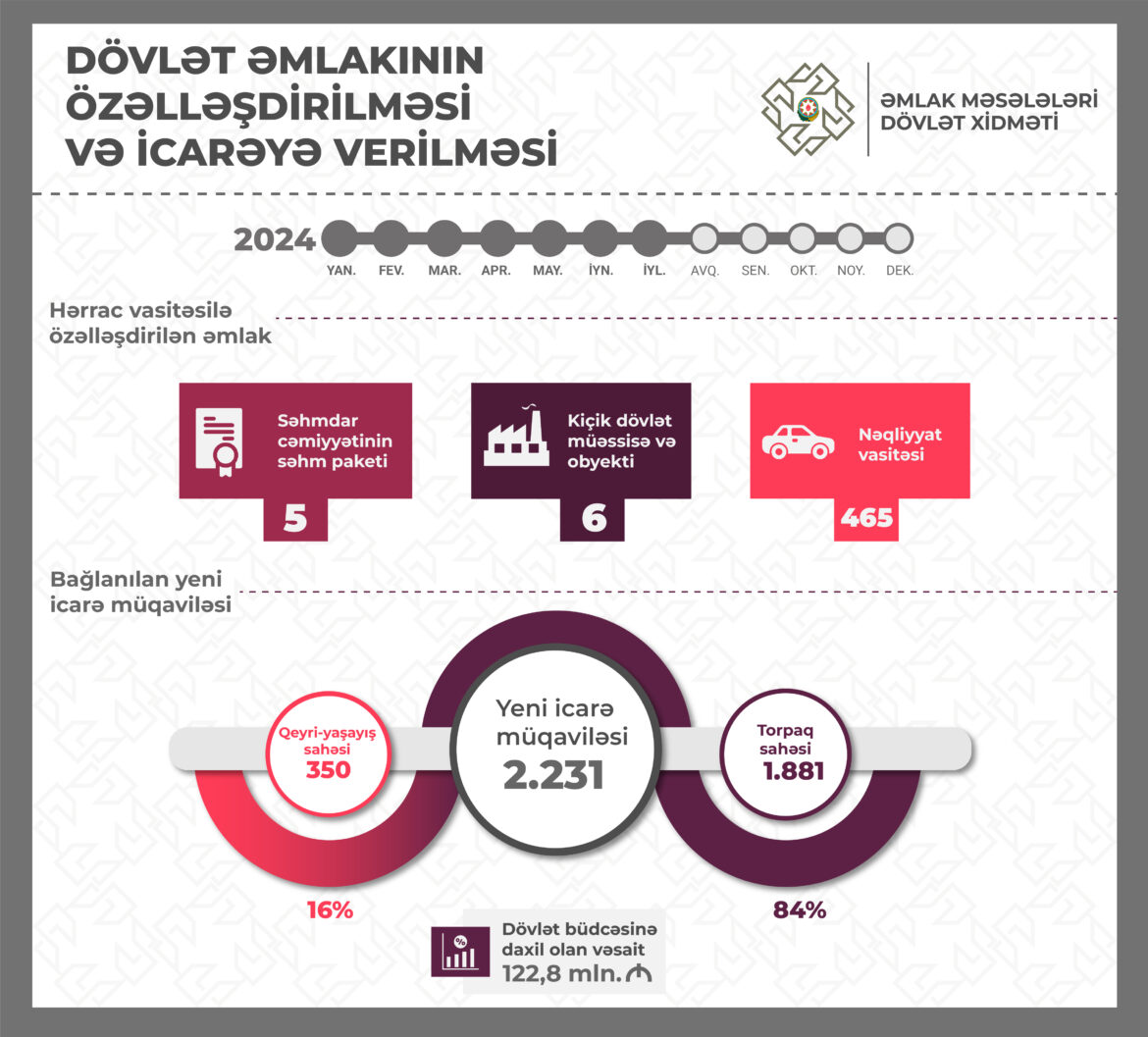 Beləliklə, 2024-cü ilin yanvar-iyul ayları ərzində dövlət əmlakının özəlləşdirilməsindən və icarəsindən büdcəyə 122,8 milyon manat vəsait daxil olub.