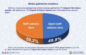 2024-cü il üzrə proqnozlaşdırılan dövlət büdcəsi gəlirlərinin 17 milyard 164 milyon manatı neft sektorunun, 17 milyard 9 milyon manatı isə qeyri-neft sektorunun payına düşür.