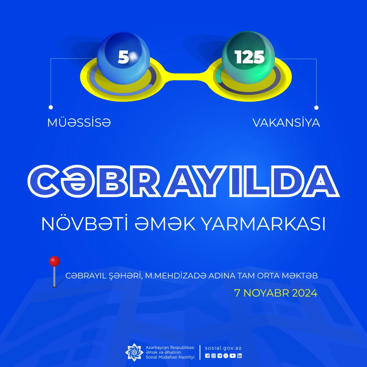 Yarmarka noyabrın 7-də saat 10:30-dan 12:00-a kimi Cəbrayıl şəhərində, M.Mehdizadə adına tam orta məktəbdə keçiriləcək.