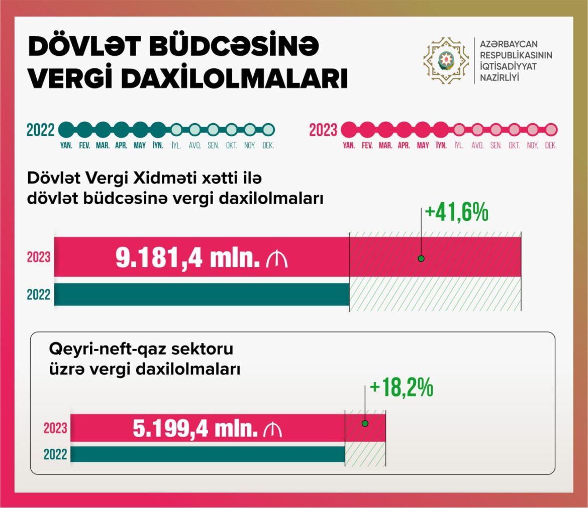 2023-cü ilin yanvar-iyun ayları ərzində İqtisadiyyat Nazirliyi yanında Dövlət Vergi Xidmətinin xətti ilə dövlət büdcəsinə 9 milyard 181,4 milyon manat həcmində vergi daxil olub. Ötən ilin müvafiq dövrü ilə müqayisədə vergi daxilolmaları 41,6% və ya 2,7 milyard manat artıb.