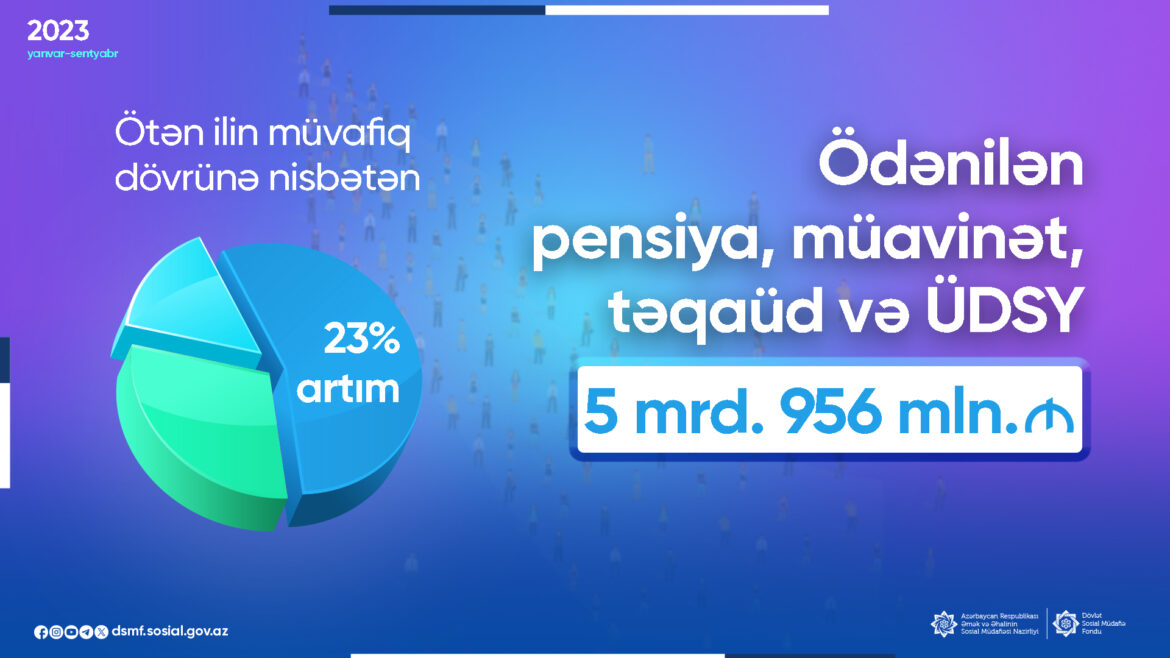 2023-cü ilin 9 ayı ərzində pensiya, müavinət, təqaüd və ünvanlı dövlət sosial yardımları üzrə əhaliyə ötən ilin müvafiq dövrünə nisbətən 1 milyard 47 milyon manat və ya 21,3% çox olmaqla 5 milyard 956 milyon manat ödənilib
