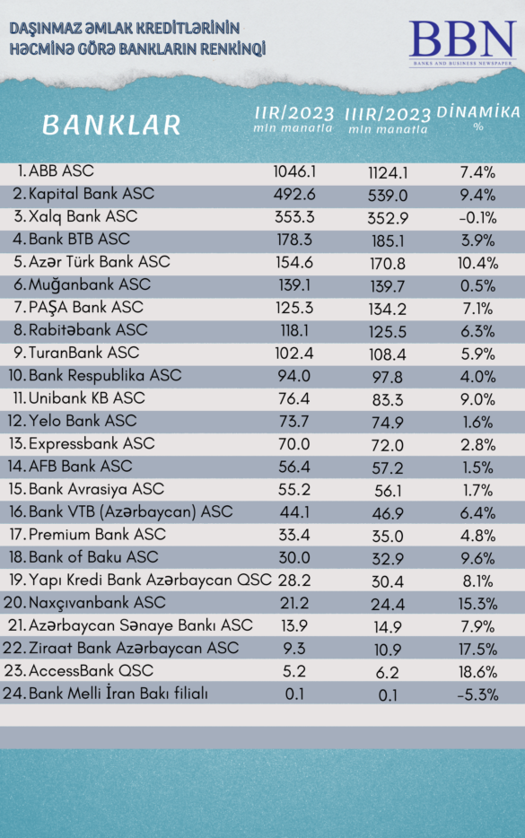 Daşınmaz əmlak kreditlərinin həcminə görə hesabatlarını açıqlayan bankların renkinqi aşağıdakı kimidir: