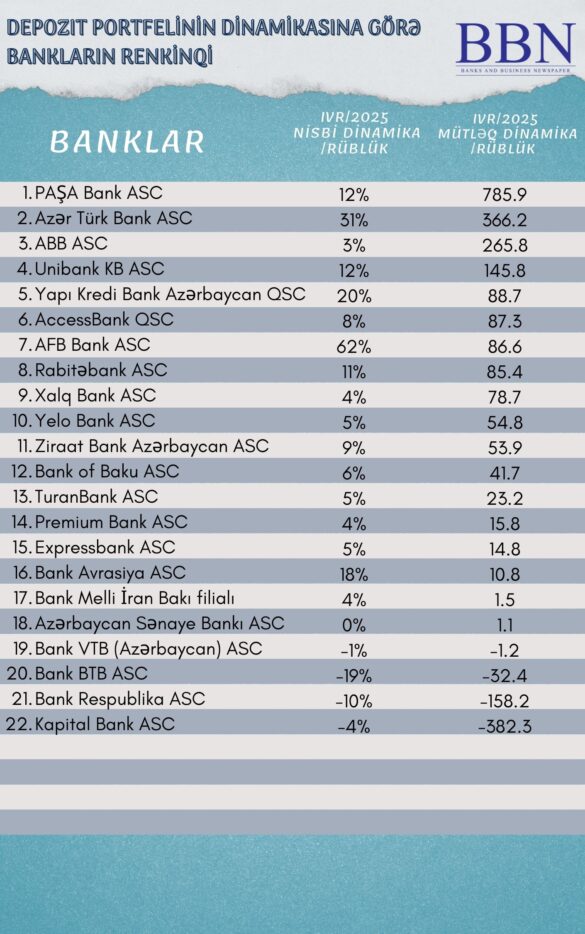 Banklar və Biznes nəşri BBN.az maliyyə göstəricilərini Azərbaycan Banklar Assosiasiyasına (ABA) təqdim etmiş bankların depozit portfelinin dinamikasına görə renkinqini təqdim edir.