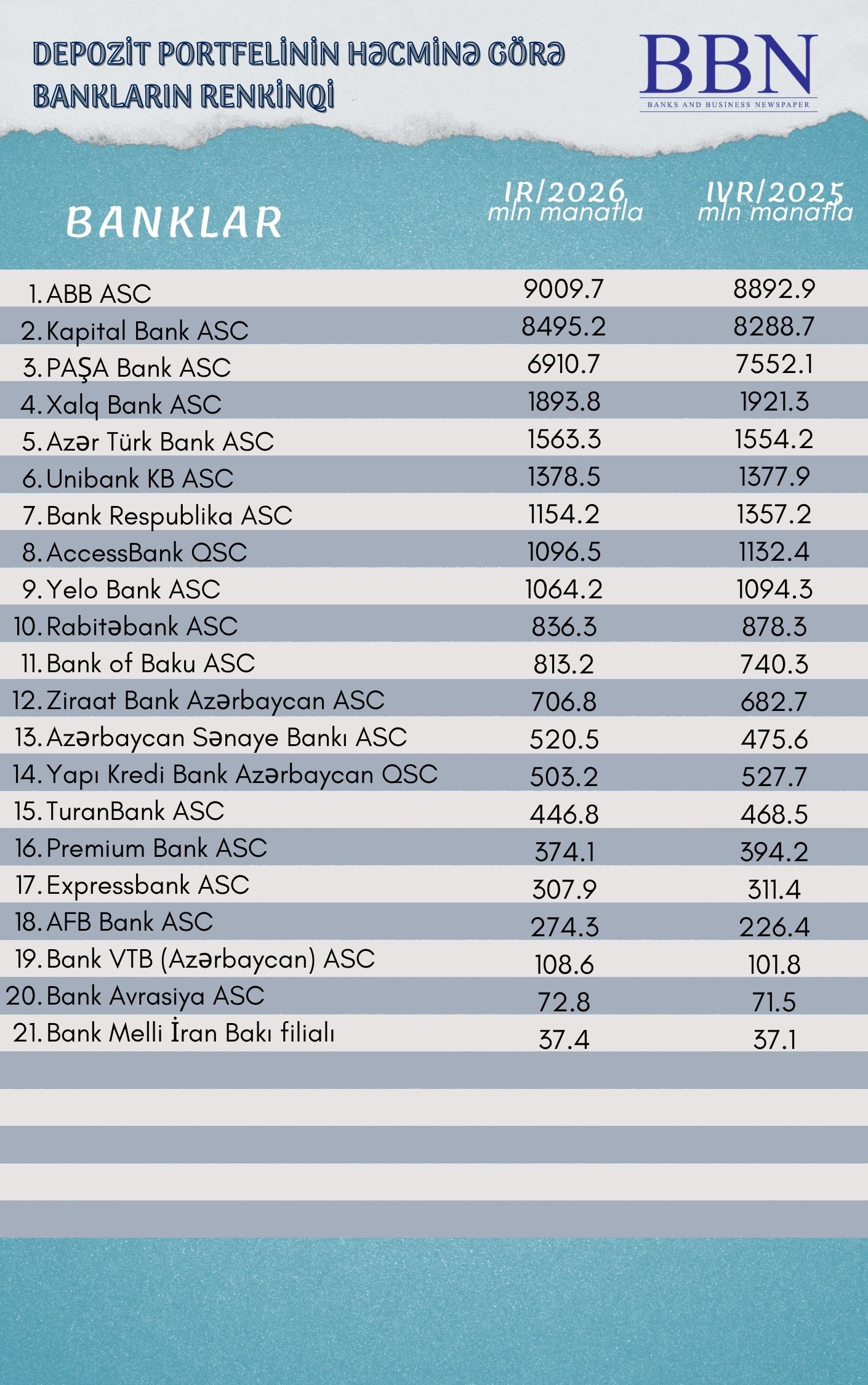 Banklar və Biznes nəşri BBN.az maliyyə göstəricilərini Azərbaycan Banklar Assosiasiyasına (ABA) təqdim etmiş bankların depozit portfelinin həcminə görə renkinqini təqdim edir.